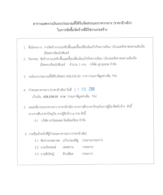 ตารางแสดงวงเงินงานปะทับพื้นและรื้อเปลี่ยนใยแก้วกันความร้อน บริเวณหลังคาสะพานเดินเรือ เรือหลวงรัตนโกสินทร์By admin / April 24, 2025