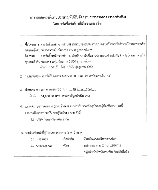 ตารางแสดงวงเงินจัดซื้อเหล็กฉากทำ JIG สำหรับรองรับชิ้นงานประกอบตัวเรือโครงการเรือขุด