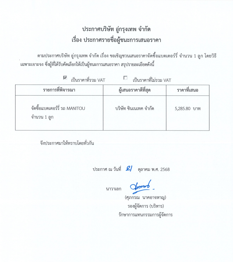 ประกาศผู้ชนะเสนอราคาจัดจ้างซ่อมรถโฟล์คลิฟ 8ตัน