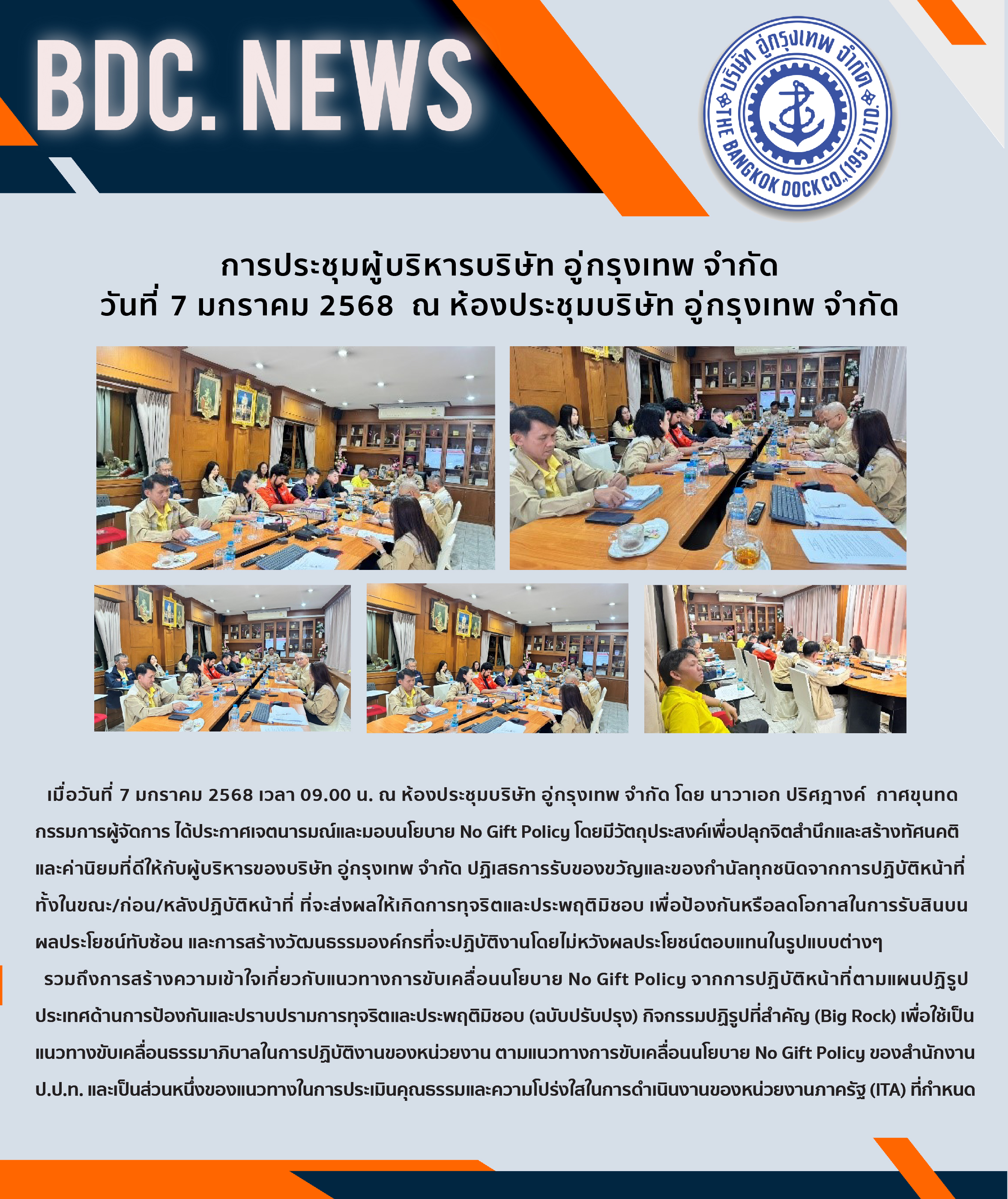 BDC NEWS: การประชุมผู้บริหารเพื่อมอบนโยบาย No Gift Policy ประจำปีงบประมาณ พ.ศ. 2568 วันที่ 7 มค 68By admin / January 7, 2025